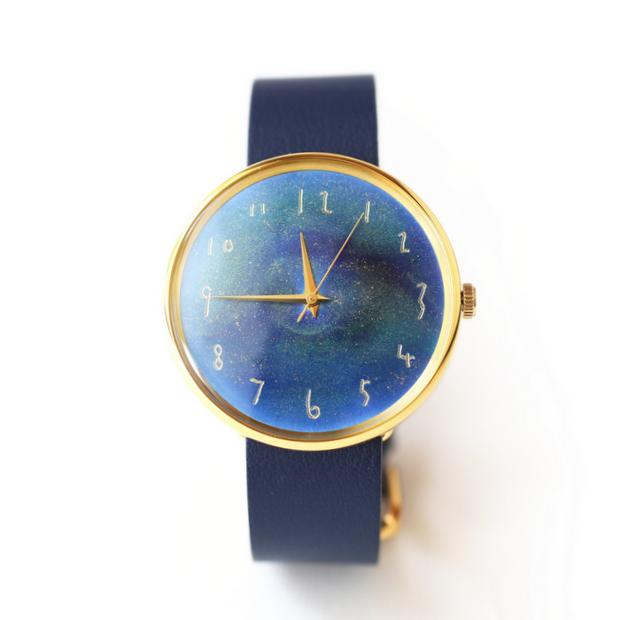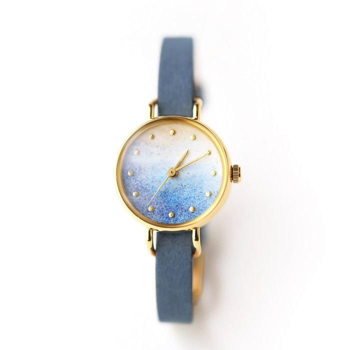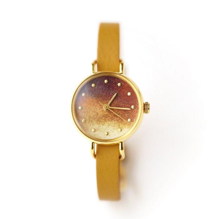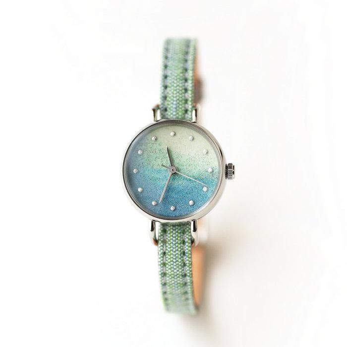 岩絵具一つ一つの粒子が、モネの筆跡のように複雑に混ざり合い、深く美しい配色となった時計を眺めていただくことで