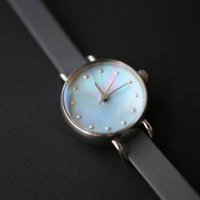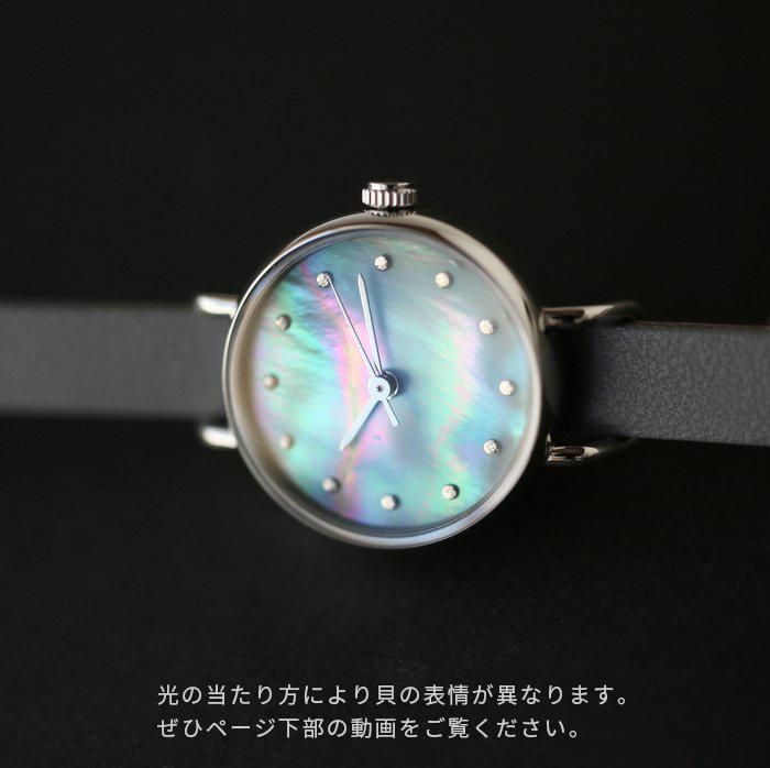 貝の真珠層が作り出す虹色の輝きは、太古の時代から人々を魅了してきました。 そうした貝の魅力を閉じ込めた腕時計です。 薄く加工された貝素材は半透明なので、裏面に色を塗ることで表面から見るとその色が透けて見え、貝の輝きを引き立てつつ色を付けることができます。伏彩色(ふせざいしき)といい、べっ甲や琥珀など透明素材に用いる伝統技法です。 貝の種類によっても輝き方が違い、模様も一つとして同じものがありません。そうした天然素材ならではの多様な表情や個性をあえて活かし、文字盤に仕立てました。 そのため、一個限定の商品で、売れ次第販売終了となります。予めご了承ください。