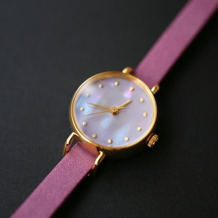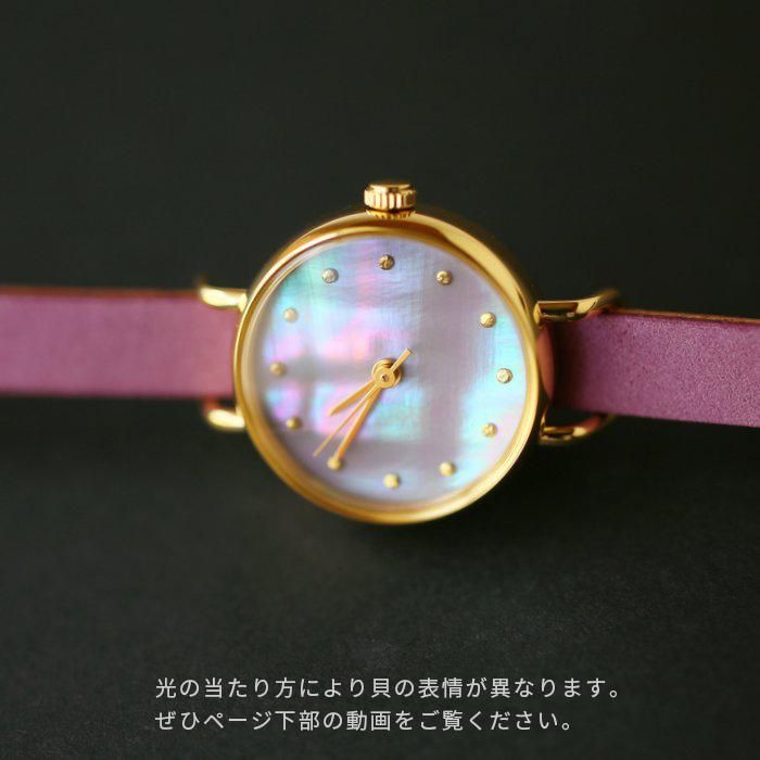 貝の真珠層が作り出す虹色の輝きは、太古の時代から人々を魅了してきました。 そうした貝の魅力を閉じ込めた腕時計です。 薄く加工された貝素材は半透明なので、裏面に色を塗ることで表面から見るとその色が透けて見え、貝の輝きを引き立てつつ色を付けることができます。伏彩色(ふせざいしき)といい、べっ甲や琥珀など透明素材に用いる伝統技法です。 貝の種類によっても輝き方が違い、模様も一つとして同じものがありません。そうした天然素材ならではの多様な表情や個性をあえて活かし、文字盤に仕立てました。 そのため、一個限定の商品で、売れ次第販売終了となります。予めご了承ください。