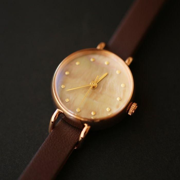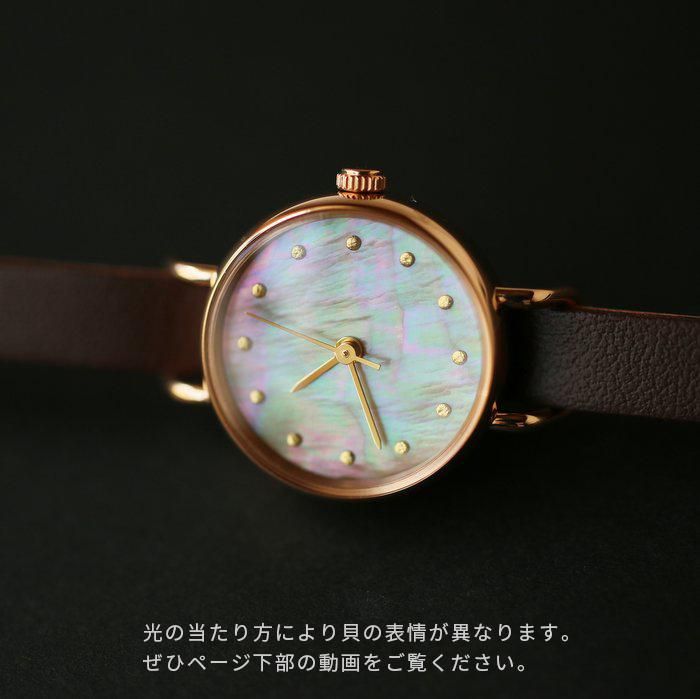 貝の真珠層が作り出す虹色の輝きは、太古の時代から人々を魅了してきました。 そうした貝の魅力を閉じ込めた腕時計です。 薄く加工された貝素材は半透明なので、裏面に色を塗ることで表面から見るとその色が透けて見え、貝の輝きを引き立てつつ色を付けることができます。伏彩色(ふせざいしき)といい、べっ甲や琥珀など透明素材に用いる伝統技法です。 貝の種類によっても輝き方が違い、模様も一つとして同じものがありません。そうした天然素材ならではの多様な表情や個性をあえて活かし、文字盤に仕立てました。 そのため、一個限定の商品で、売れ次第販売終了となります。予めご了承ください。