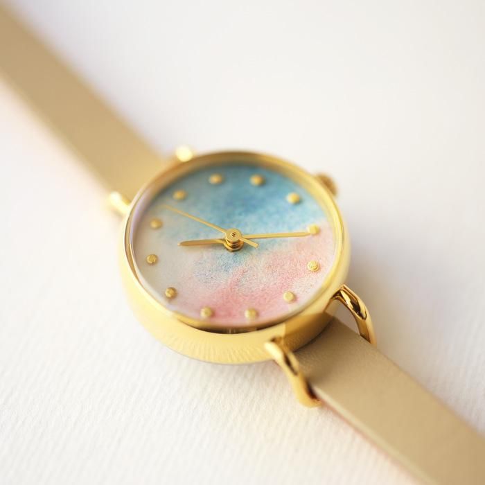 様々な色の粒子が混ざりあい、抽象的でありながらも、空や雲、水面といった大きな自然の風景を感じる腕時計です。彩りの美しい霞(かすみ)を思わせるので、彩霞(さいか)と名付けました。