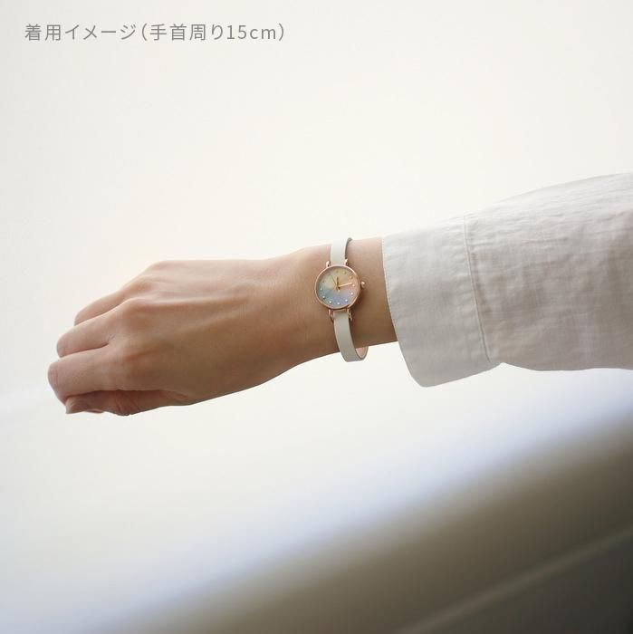 ベルトには7個穴が開いており、中央の穴で留めた場合、手首周りが15.5cmの方がちょうどよくお使いいただけます。