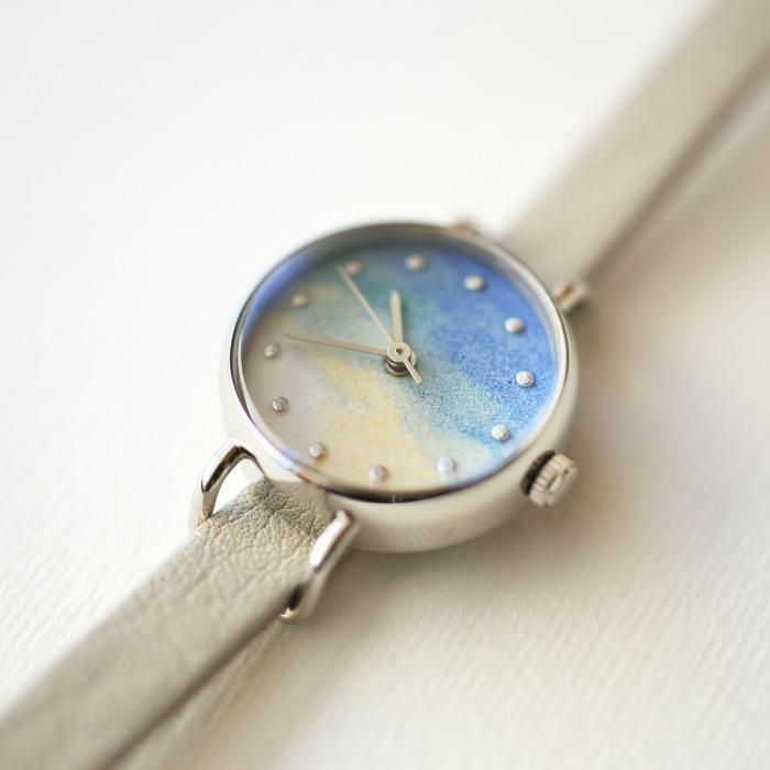 様々な色の粒子が混ざりあい、抽象的でありながらも、空や雲、水面といった大きな自然の風景を感じる腕時計です。彩りの美しい霞(かすみ)を思わせるので、彩霞(さいか)と名付けました。