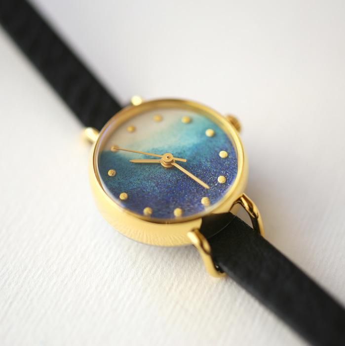 様々な色の粒子が混ざりあい、抽象的でありながらも、空や雲、水面といった大きな自然の風景を感じる腕時計です。彩りの美しい霞(かすみ)を思わせるので、彩霞(さいか)と名付けました。