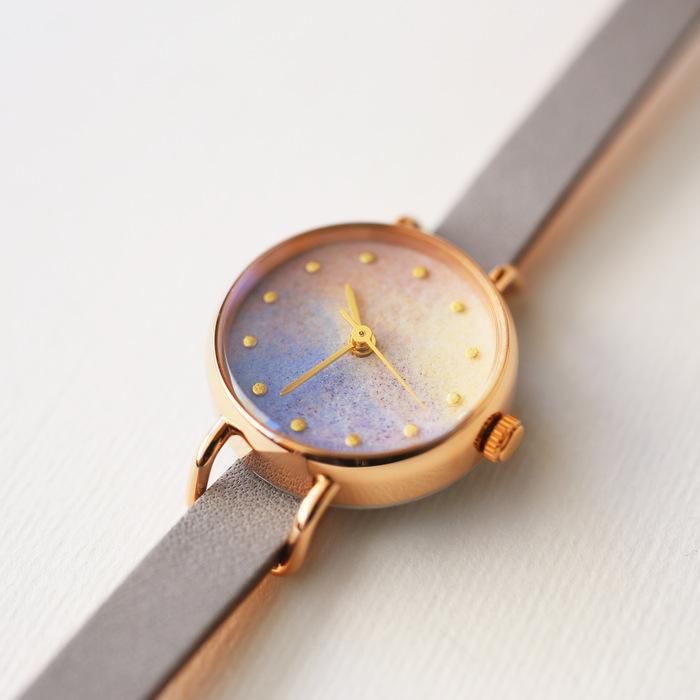様々な色の粒子が混ざりあい、抽象的でありながらも、空や雲、水面といった大きな自然の風景を感じる腕時計です。彩りの美しい霞(かすみ)を思わせるので、彩霞(さいか)と名付けました。