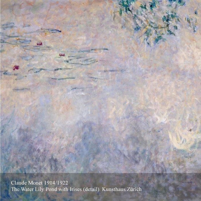 クロード・モネの絵画の配色を参考に、岩絵具を塗りました。岩絵具一つ一つの粒子が、モネの筆跡のように複雑に混ざり合い、深く美しい配色になっております。