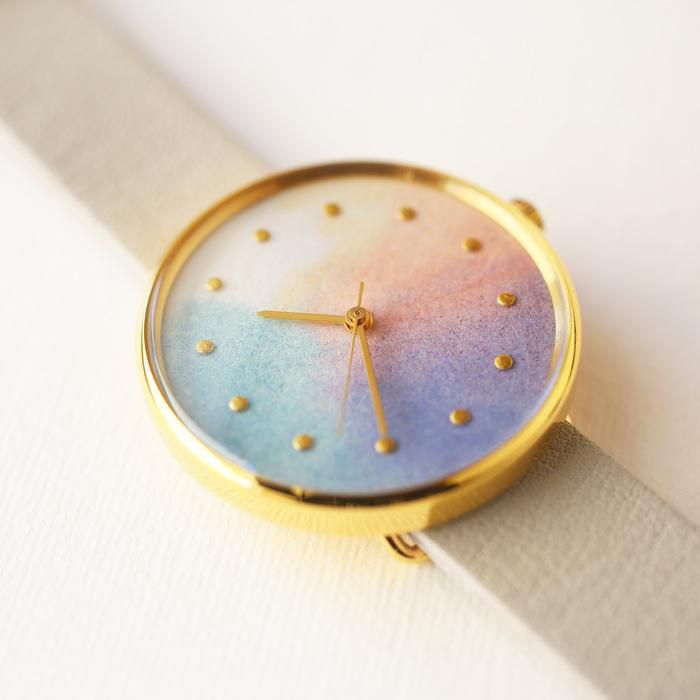 様々な色の粒子が混ざりあい、抽象的でありながらも、空や雲、水面といった大きな自然の風景を感じる腕時計です。彩りの美しい霞(かすみ)を思わせるので、彩霞(さいか)と名付けました。