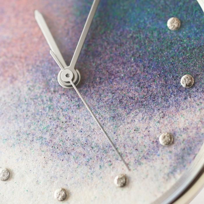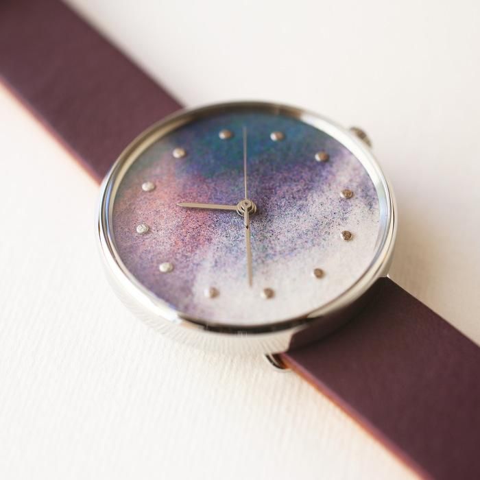 様々な色の粒子が混ざりあい、抽象的でありながらも、空や雲、水面といった大きな自然の風景を感じる腕時計です。彩りの美しい霞(かすみ)を思わせるので、彩霞(さいか)と名付けました。