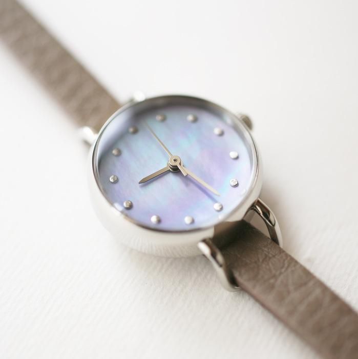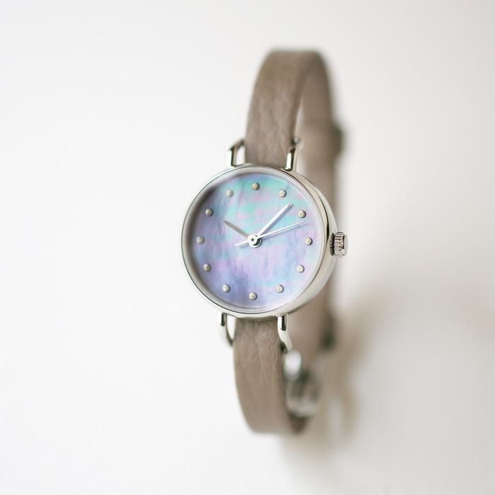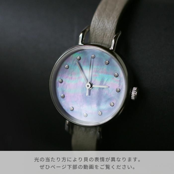 貝の真珠層が作り出す虹色の輝きは、太古の時代から人々を魅了してきました。 そうした貝の魅力を閉じ込めた腕時計です。 薄く加工された貝素材は半透明なので、裏面に色を塗ることで表面から見るとその色が透けて見え、貝の輝きを引き立てつつ色を付けることができます。伏彩色(ふせざいしき)といい、べっ甲や琥珀など透明素材に用いる伝統技法です。 貝の種類によっても輝き方が違い、模様も一つとして同じものがありません。そうした天然素材ならではの多様な表情や個性をあえて活かし、文字盤に仕立てました。 そのため、一個限定の商品で、売れ次第販売終了となります。予めご了承ください。