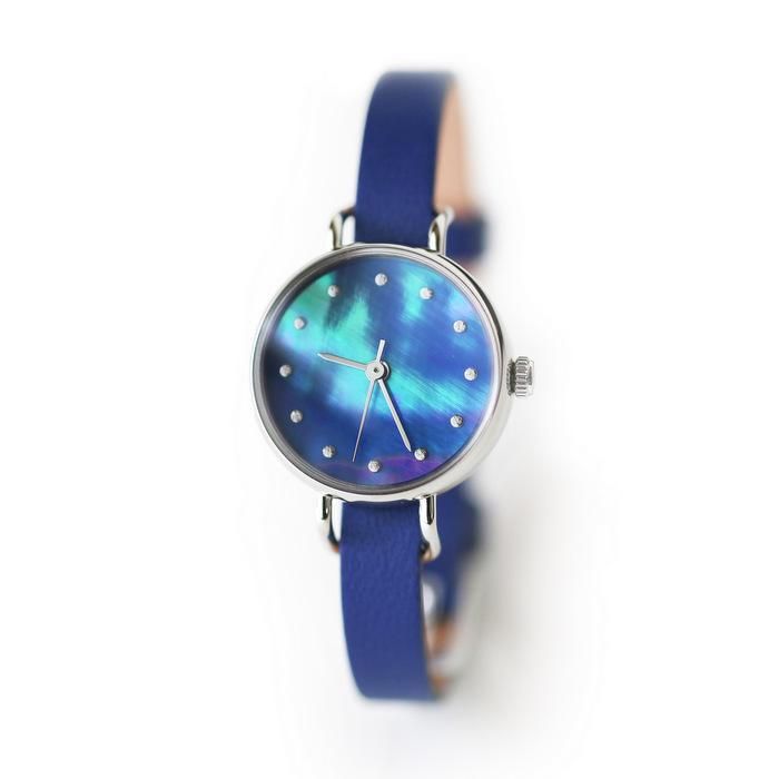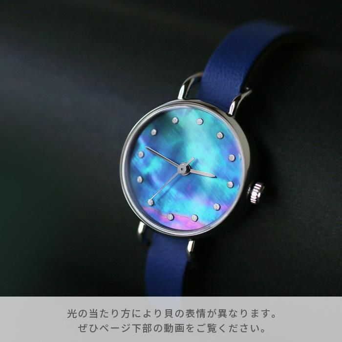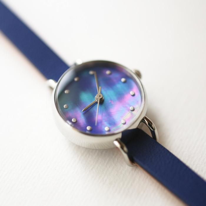 貝の真珠層が作り出す虹色の輝きは、太古の時代から人々を魅了してきました。 そうした貝の魅力を閉じ込めた腕時計です。 薄く加工された貝素材は半透明なので、裏面に色を塗ることで表面から見るとその色が透けて見え、貝の輝きを引き立てつつ色を付けることができます。伏彩色(ふせざいしき)といい、べっ甲や琥珀など透明素材に用いる伝統技法です。 貝の種類によっても輝き方が違い、模様も一つとして同じものがありません。そうした天然素材ならではの多様な表情や個性をあえて活かし、文字盤に仕立てました。 そのため、一個限定の商品で、売れ次第販売終了となります。予めご了承ください。