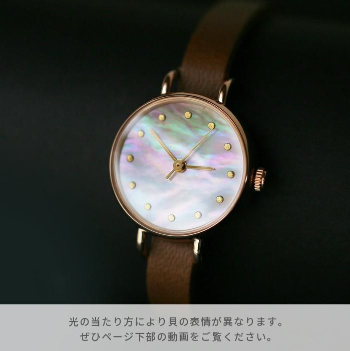 貝の真珠層が作り出す虹色の輝きは、太古の時代から人々を魅了してきました。 そうした貝の魅力を閉じ込めた腕時計です。 薄く加工された貝素材は半透明なので、裏面に色を塗ることで表面から見るとその色が透けて見え、貝の輝きを引き立てつつ色を付けることができます。伏彩色(ふせざいしき)といい、べっ甲や琥珀など透明素材に用いる伝統技法です。 貝の種類によっても輝き方が違い、模様も一つとして同じものがありません。そうした天然素材ならではの多様な表情や個性をあえて活かし、文字盤に仕立てました。 そのため、一個限定の商品で、売れ次第販売終了となります。予めご了承ください。