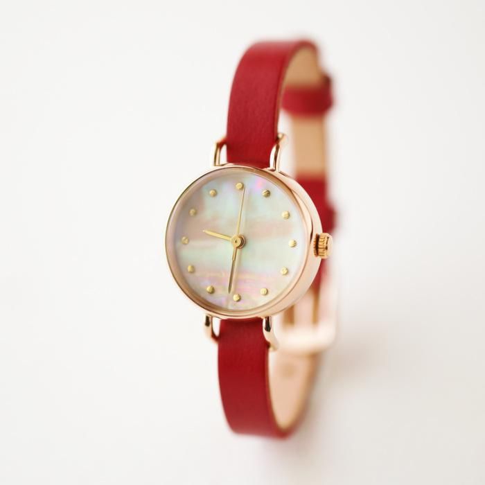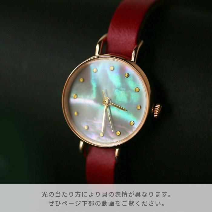貝の真珠層が作り出す虹色の輝きは、太古の時代から人々を魅了してきました。 そうした貝の魅力を閉じ込めた腕時計です。 薄く加工された貝素材は半透明なので、裏面に色を塗ることで表面から見るとその色が透けて見え、貝の輝きを引き立てつつ色を付けることができます。伏彩色(ふせざいしき)といい、べっ甲や琥珀など透明素材に用いる伝統技法です。 貝の種類によっても輝き方が違い、模様も一つとして同じものがありません。そうした天然素材ならではの多様な表情や個性をあえて活かし、文字盤に仕立てました。 そのため、一個限定の商品で、売れ次第販売終了となります。予めご了承ください。