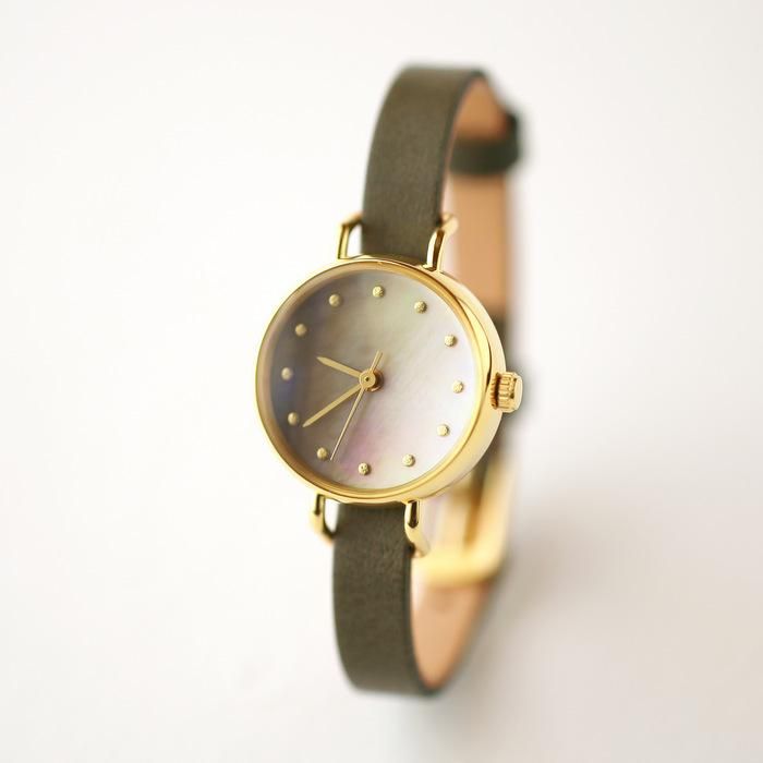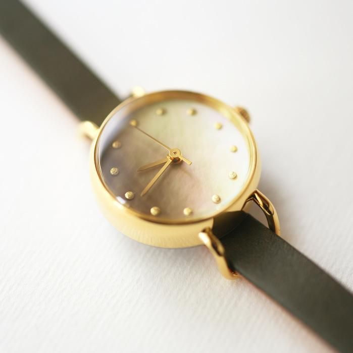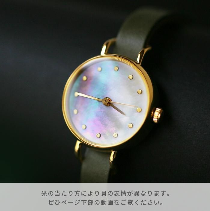 貝の真珠層が作り出す虹色の輝きは、太古の時代から人々を魅了してきました。 そうした貝の魅力を閉じ込めた腕時計です。 薄く加工された貝素材は半透明なので、裏面に色を塗ることで表面から見るとその色が透けて見え、貝の輝きを引き立てつつ色を付けることができます。伏彩色(ふせざいしき)といい、べっ甲や琥珀など透明素材に用いる伝統技法です。 貝の種類によっても輝き方が違い、模様も一つとして同じものがありません。そうした天然素材ならではの多様な表情や個性をあえて活かし、文字盤に仕立てました。 そのため、一個限定の商品で、売れ次第販売終了となります。予めご了承ください。