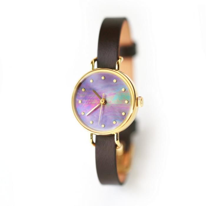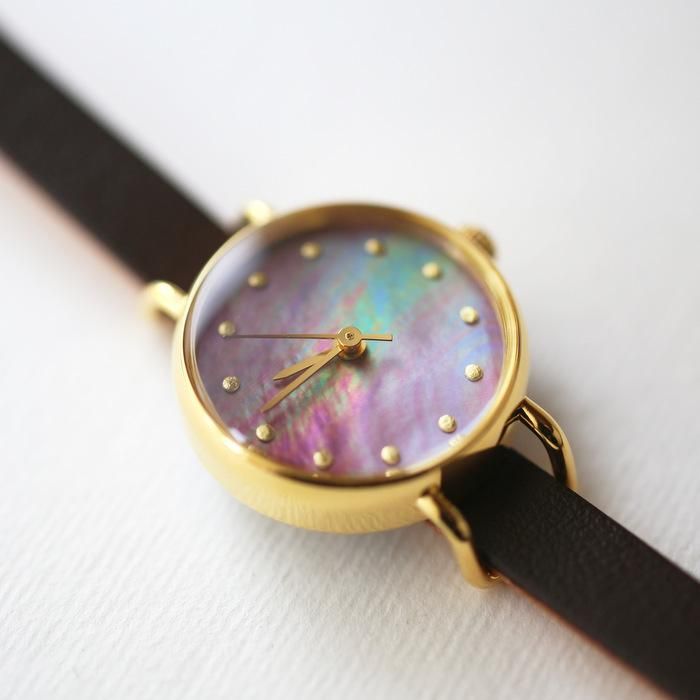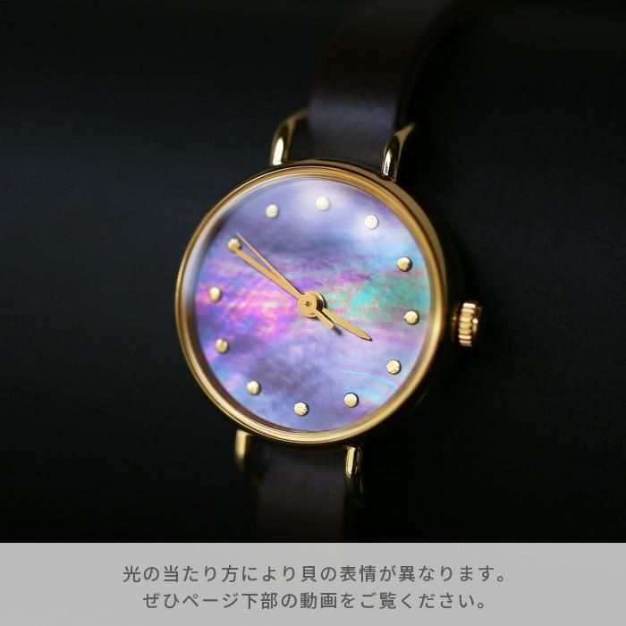 貝の真珠層が作り出す虹色の輝きは、太古の時代から人々を魅了してきました。 そうした貝の魅力を閉じ込めた腕時計です。 薄く加工された貝素材は半透明なので、裏面に色を塗ることで表面から見るとその色が透けて見え、貝の輝きを引き立てつつ色を付けることができます。伏彩色(ふせざいしき)といい、べっ甲や琥珀など透明素材に用いる伝統技法です。 貝の種類によっても輝き方が違い、模様も一つとして同じものがありません。そうした天然素材ならではの多様な表情や個性をあえて活かし、文字盤に仕立てました。 そのため、一個限定の商品で、売れ次第販売終了となります。予めご了承ください。