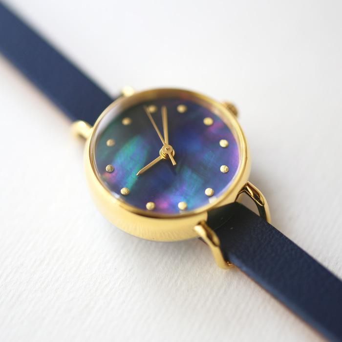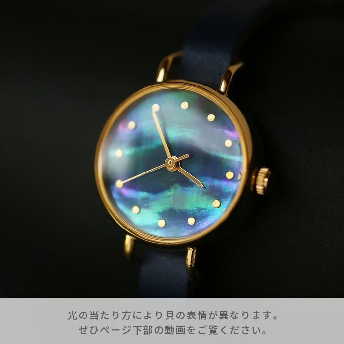 貝の真珠層が作り出す虹色の輝きは、太古の時代から人々を魅了してきました。 そうした貝の魅力を閉じ込めた腕時計です。 薄く加工された貝素材は半透明なので、裏面に色を塗ることで表面から見るとその色が透けて見え、貝の輝きを引き立てつつ色を付けることができます。伏彩色(ふせざいしき)といい、べっ甲や琥珀など透明素材に用いる伝統技法です。 貝の種類によっても輝き方が違い、模様も一つとして同じものがありません。そうした天然素材ならではの多様な表情や個性をあえて活かし、文字盤に仕立てました。 そのため、一個限定の商品で、売れ次第販売終了となります。予めご了承ください。