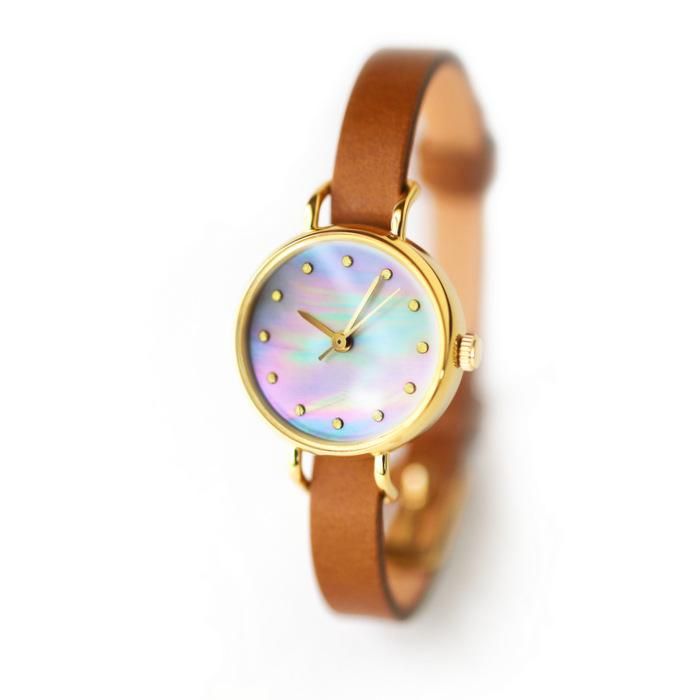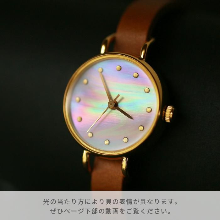 貝の真珠層が作り出す虹色の輝きは、太古の時代から人々を魅了してきました。 そうした貝の魅力を閉じ込めた腕時計です。 薄く加工された貝素材は半透明なので、裏面に色を塗ることで表面から見るとその色が透けて見え、貝の輝きを引き立てつつ色を付けることができます。伏彩色(ふせざいしき)といい、べっ甲や琥珀など透明素材に用いる伝統技法です。 貝の種類によっても輝き方が違い、模様も一つとして同じものがありません。そうした天然素材ならではの多様な表情や個性をあえて活かし、文字盤に仕立てました。 そのため、一個限定の商品で、売れ次第販売終了となります。予めご了承ください。