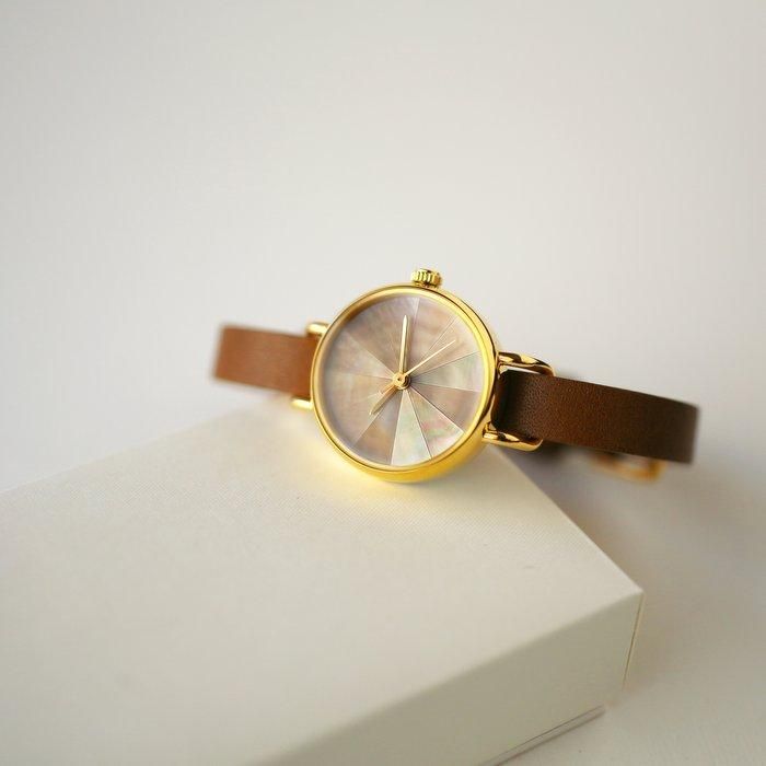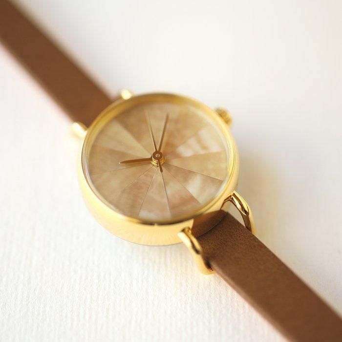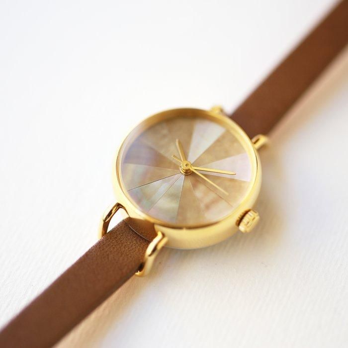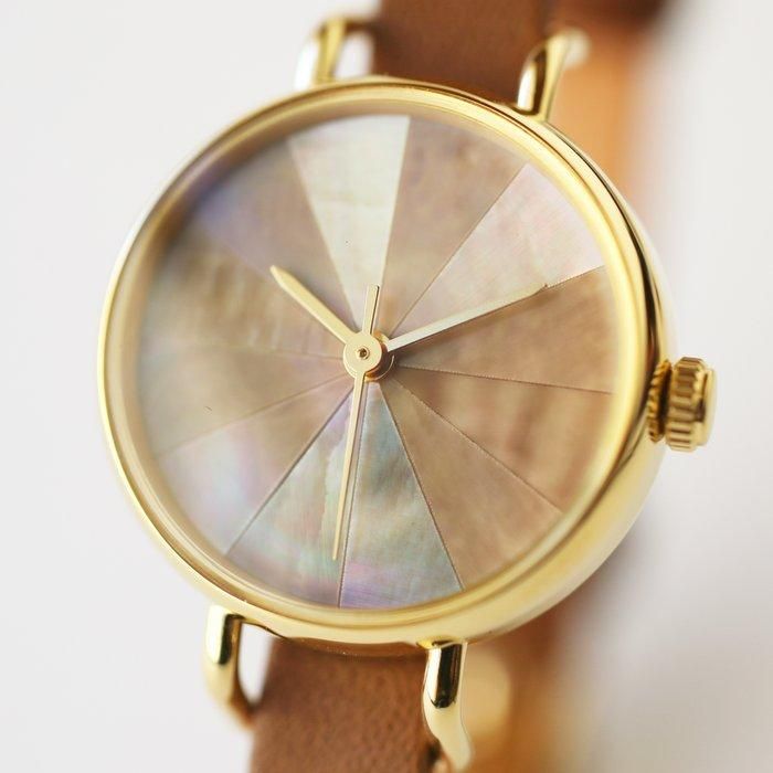 こちらの文字盤には、黒蝶貝の淡い茶色の部分のみを選び取り、12のパーツに切り分けて貼り合わせました。 それぞれの断片が繊細に虹色の光を放ちながら、貝の継ぎ目を際立たせ、時間を示すインデックスとしても機能するようにデザインしております。