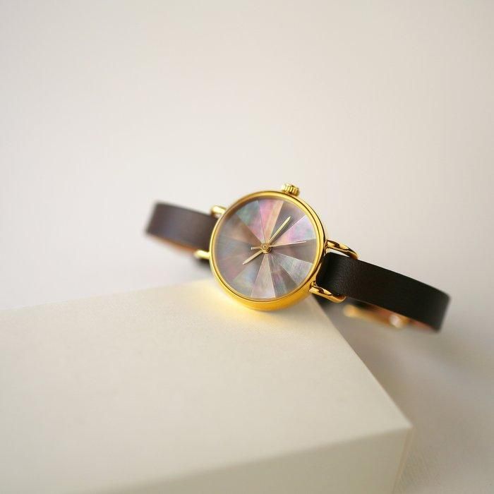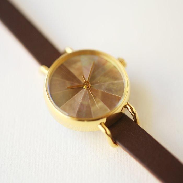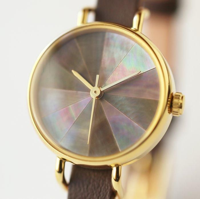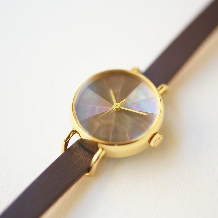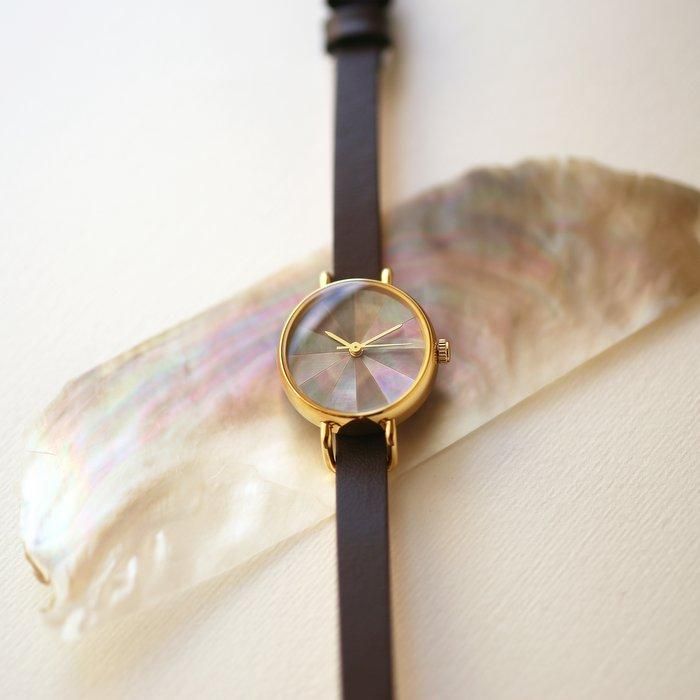 こちらの文字盤には、黒蝶貝の濃い茶色の部分のみを選び取り、12のパーツに切り分けて貼り合わせました。 それぞれの断片が繊細に虹色の光を放ちながら、貝の継ぎ目を際立たせ、時間を示すインデックスとしても機能するようにデザインしております。