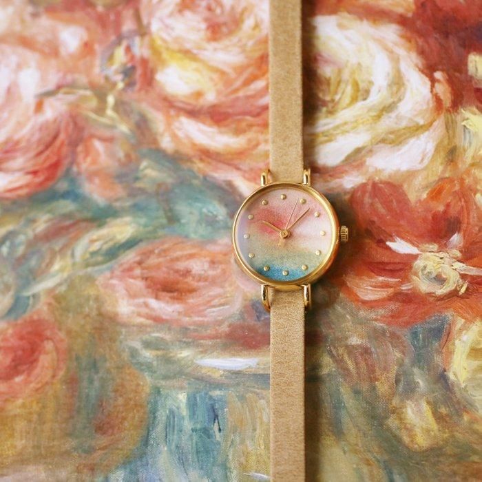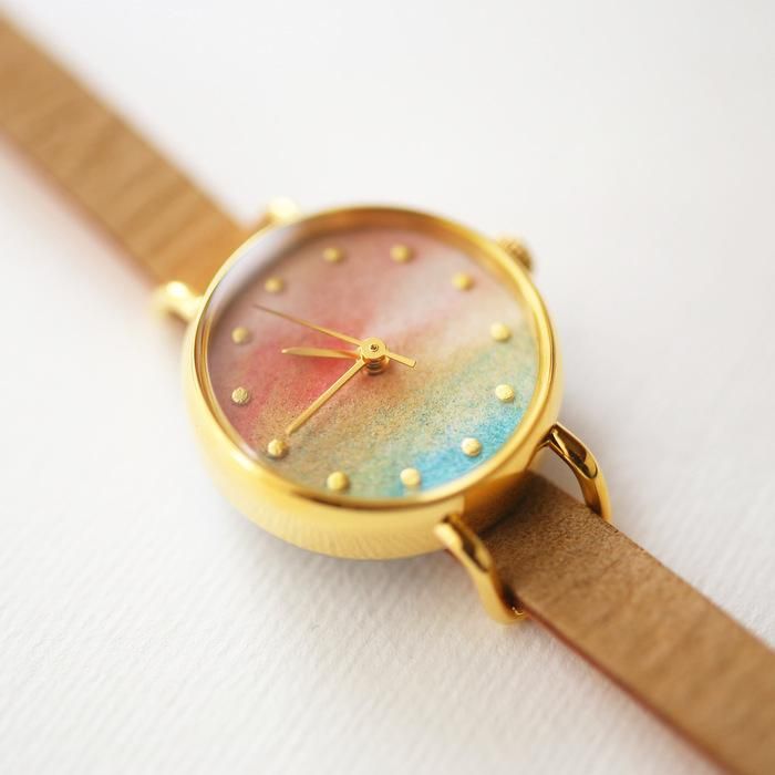 様々な色の粒子が混ざりあい、抽象的でありながらも、空や雲、水面といった大きな自然の風景を感じる腕時計です。彩りの美しい霞(かすみ)を思わせるので、彩霞(さいか)と名付けました。