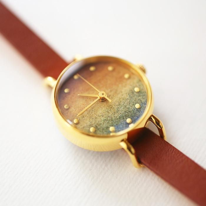 様々な色の粒子が混ざりあい、抽象的でありながらも、空や雲、水面といった大きな自然の風景を感じる腕時計です。彩りの美しい霞(かすみ)を思わせるので、彩霞(さいか)と名付けました。