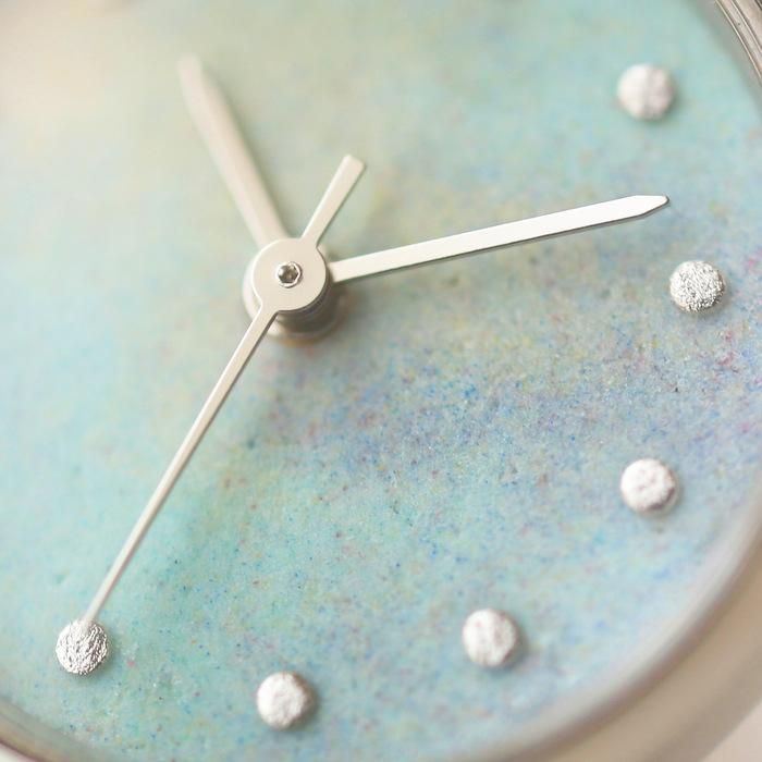 様々な色の粒子が混ざりあい、抽象的でありながらも、空や雲、水面といった大きな自然の風景を感じる腕時計です。彩りの美しい霞(かすみ)を思わせるので、彩霞(さいか)と名付けました。