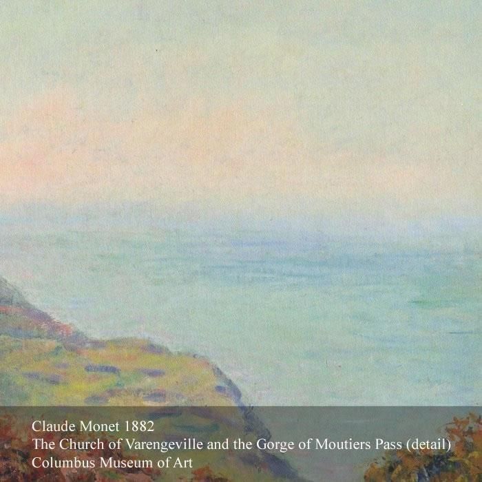 クロード・モネの絵画の配色を参考に、岩絵具を塗りました。岩絵具一つ一つの粒子が、モネの筆跡のように複雑に混ざり合い、深く美しい配色になっております。